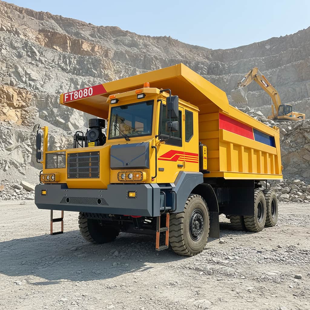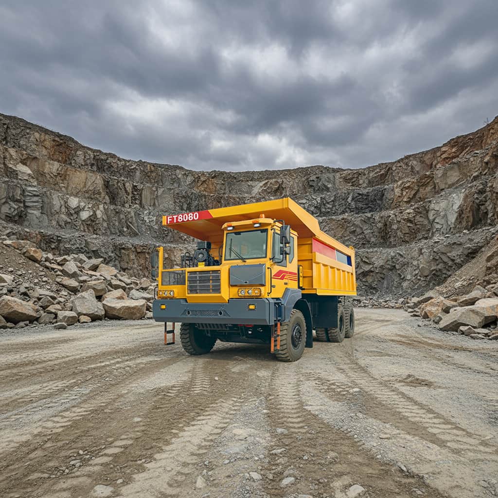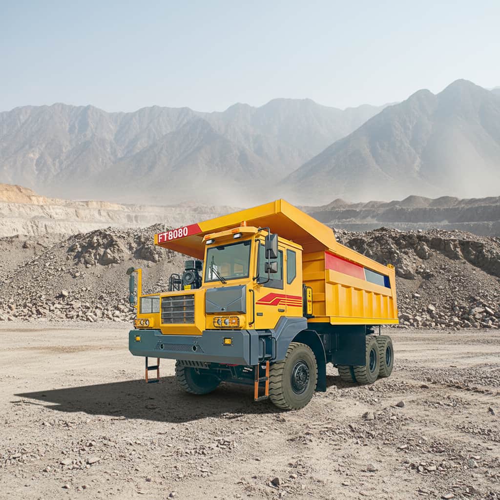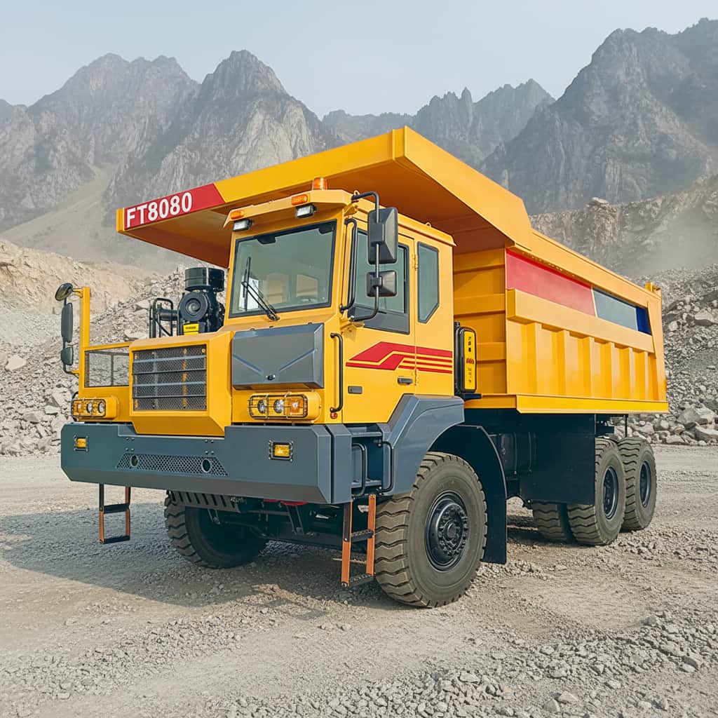 This large mining dump truck is designed for heavy-duty work, with a flip-type wide-body left-hand drive cab. Powered by 420hp Weichai WD12G420E211 engine and matched with Fast 7DS220 transmission, it has strong power. It adopts Shashi Jiulong steering gear, FMAN cast steel axles, 14.00-25PR mining tires and SORL braking system. Its frame is 480*140 welded type, cargo box (5600*2850*1550mm) is Q345 material. Curb weight 30000kg, rated load 80000kg, top speed 42km/h, max climbing 40%, suitable for harsh mining scenarios.